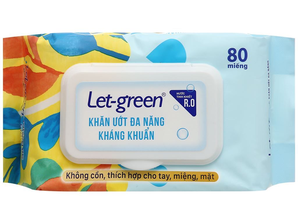 Khăn ướt đa năng kháng khuẩn Let Green không chứa cồn, sử dụng nước tinh khiết R.O, chứa hoạt chất giúp ức chế hiệu quả vi khuẩn. Sản phẩm có thể sử dụng hàng ngày, phù hợp cho mọi lứa tuổi.